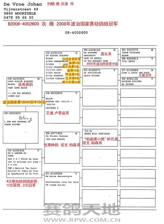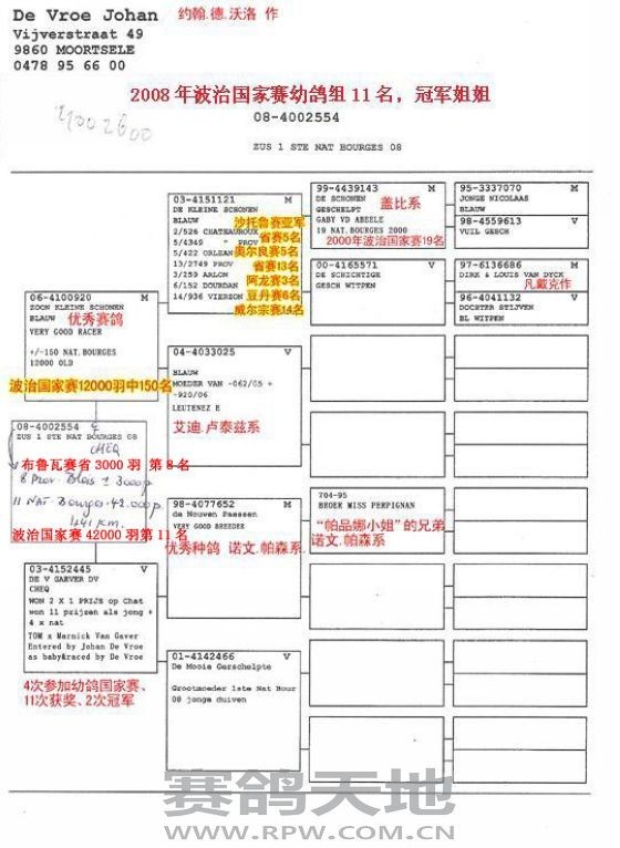 在此要特別跟大家提到的是,在第二場(chǎng)波治國(guó)家賽幼鴿組中,獲得冠軍和第11名的兩羽賽鴿是由約翰·德·沃洛作育的同胞姐妹。