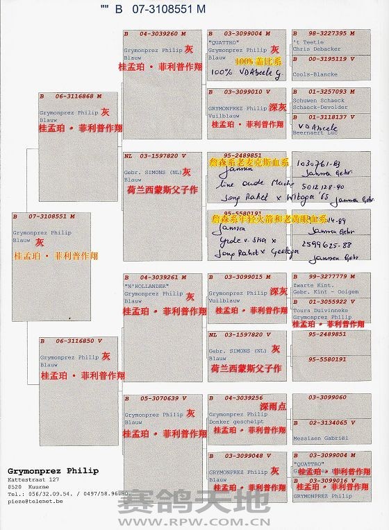 展開(kāi)冠軍鴿的血統(tǒng)表,我們可以看到蓋比、詹森等幾位歐洲養(yǎng)鴿名家的名字。冠軍鴿的父系上代流淌著蓋比系和詹森系老麥克斯血系、詹森系年輕火箭和老黃眼血系的血液。母系上代絕大部分是由冠軍桂孟珀·菲利普作翔的。這些優(yōu)秀的血統(tǒng)為造就出70889羽冠軍埋下了伏筆。