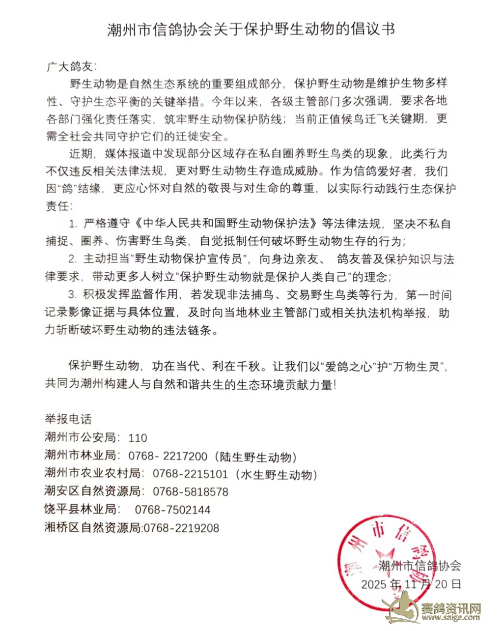 潮州市信鴿協(xié)會關于保護野生動物的倡議書