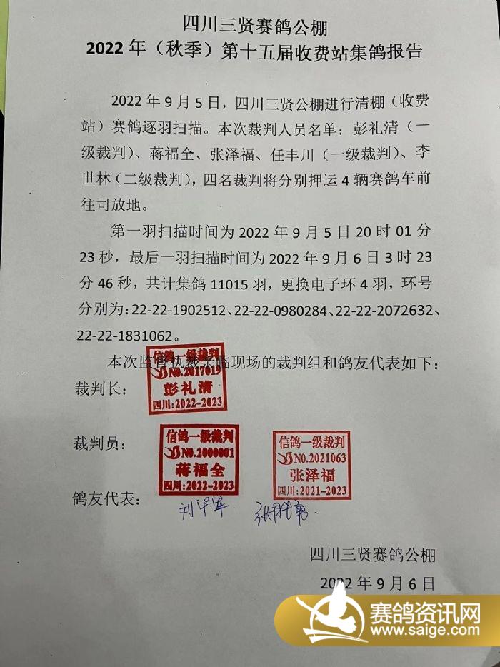 三賢公棚2022年第十五屆秋賽清棚(收費(fèi)站)集鴿報(bào)告