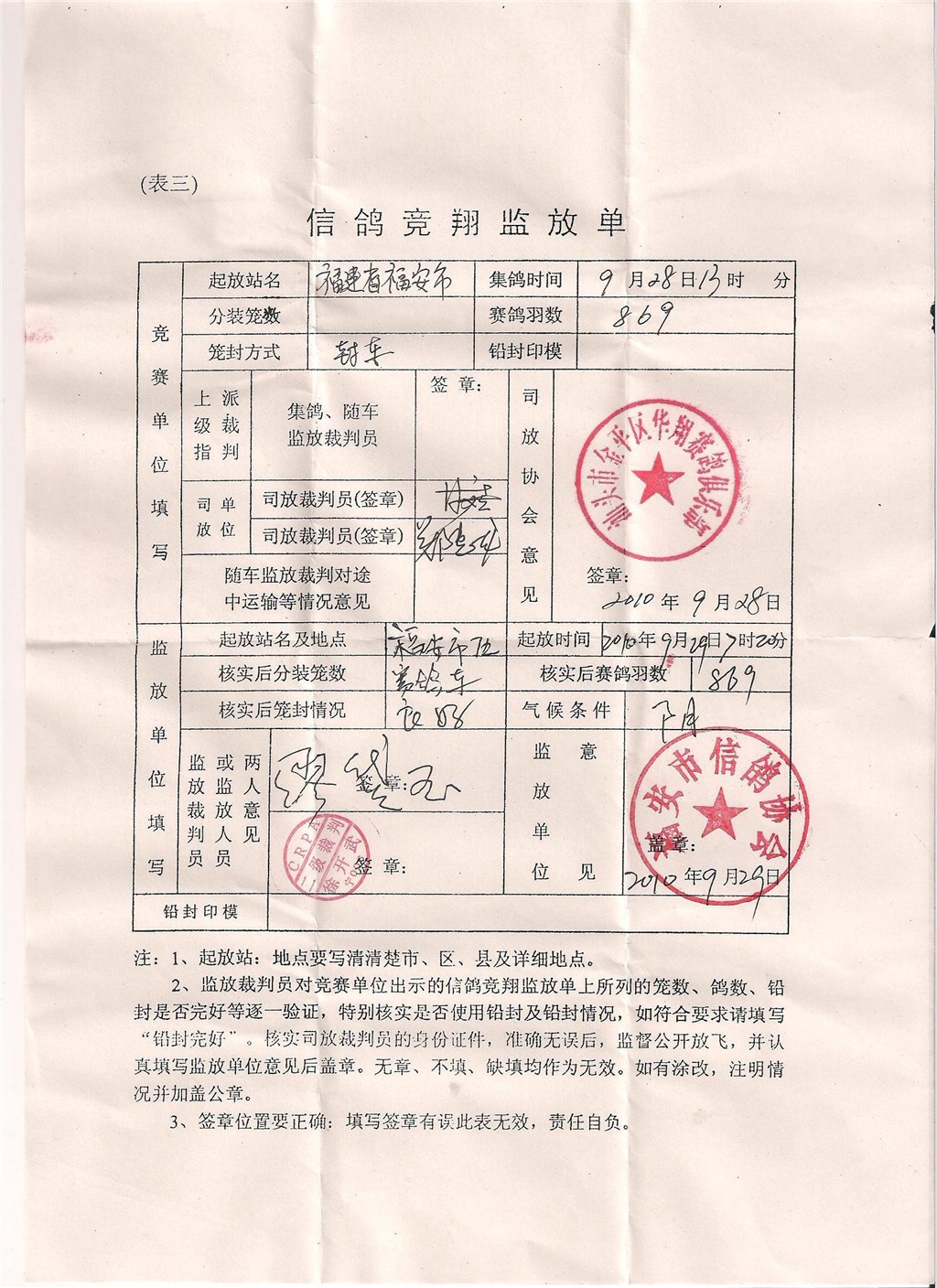 金平華翔俱樂部2010秋福安站參賽鴿更正通知